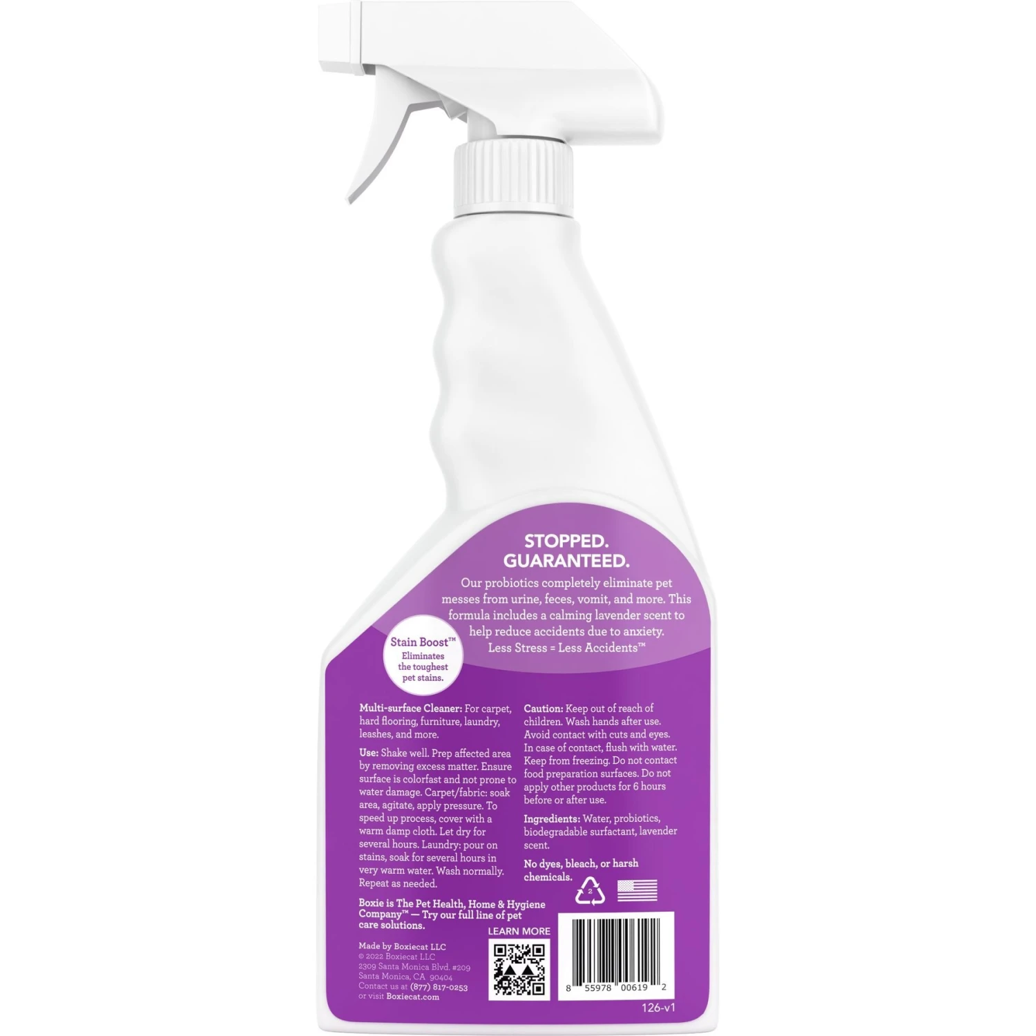 With the Boxiecat Calming Dog Stain & Odor Remover, it’s su-paw easy to clean up after messy pets. This cleaner features a blend of powerful probiotics to target pet messes from urine, feces, vomit and more. It helps eliminate the cause of stains and odors, and it leaves behind no residue. It’s tough enough to tackle stubborn stains, and you can use this multi-surface cleaner on carpet, hard flooring, furniture, laundry, leashes and more. A calming lavender scent helps reduce accidents caused by anxiety.