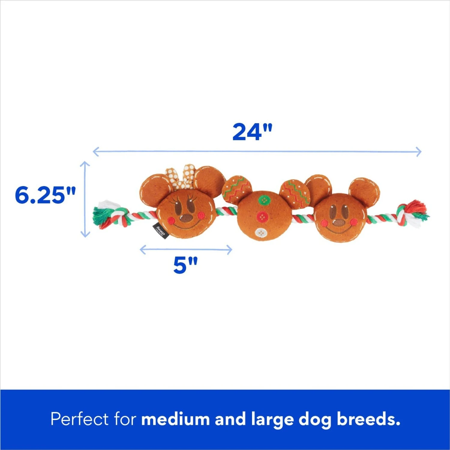 - Plush rope toy features three Mickey Mouse and Minnie Mouse gingerbread squeakies with a knotty rope running through them.