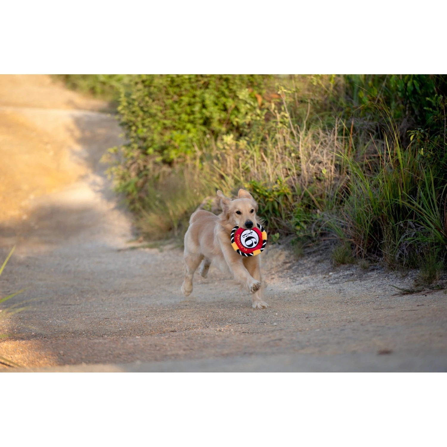 - This frisbee features a chewable rope edging and a soft plush center for multisensory fun.