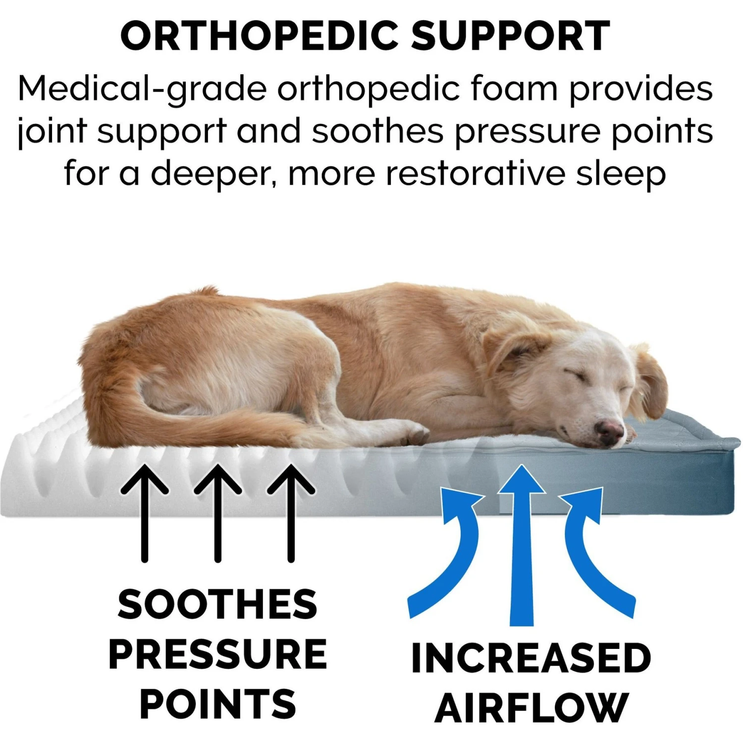 Give your fur baby her very own place to burrow and snuggle with FurHaven Quilt Top Orthopedic Convertible Indoor/Outdoor Cat & Dog Bed! Featuring a water-resistant poly-canvas base and a removable, quilted top panel, this bed is paw-fect for indoor and outdoor use. The removable, padded top panel provides extra cushioning—it can also act as a pocket for cooling and heating pads! The convoluted, orthopedic foam base supports your fur baby’s joints and pressure points, alleviates pain and promotes circulation for a better night’s sleep. The low-profile, step-on design makes it accessible for older and disabled pets as well. This easy to clean, comfy bed is paw-fect for pets who love to sprawl out when they get their beauty sleep.