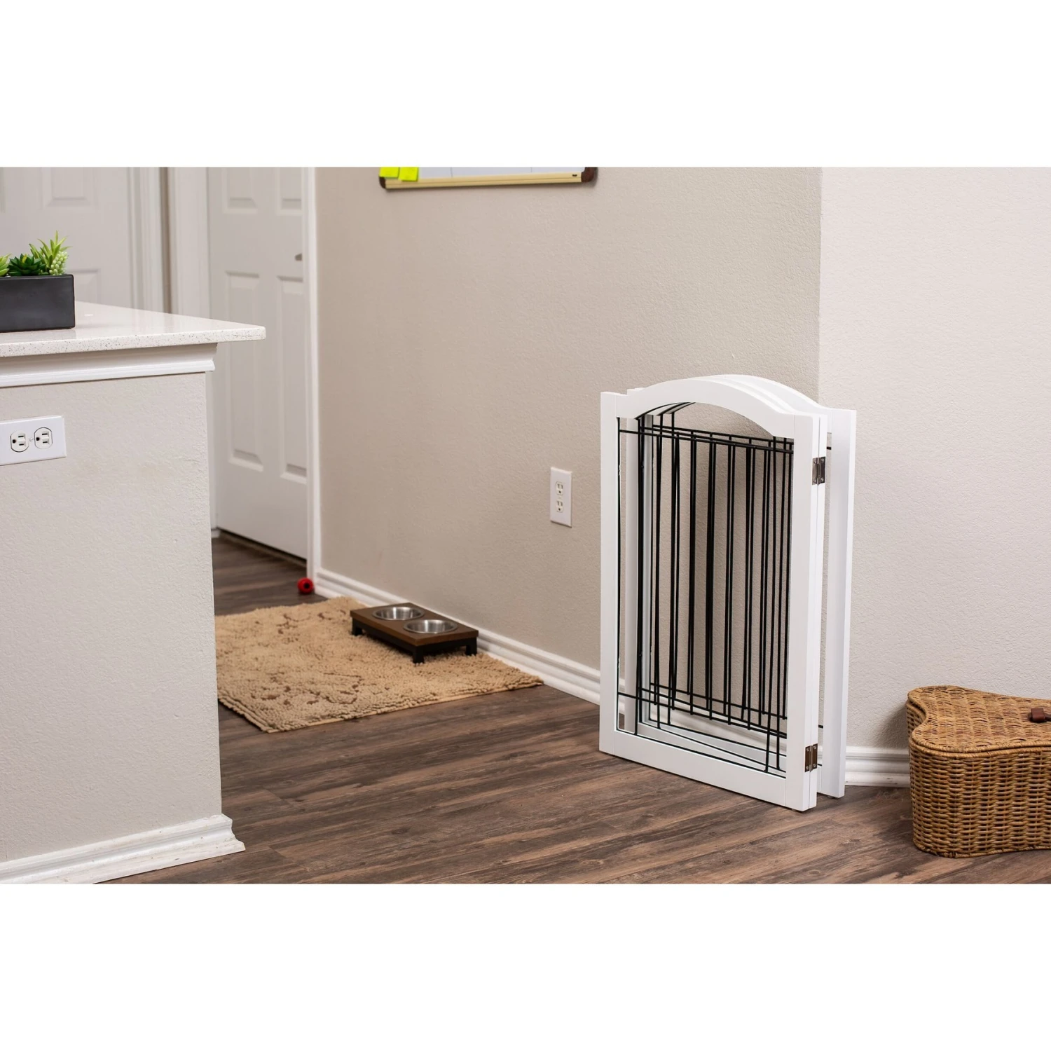 Help keep your pet in his own paw-sonal space with Internet’s Best Arched Top Wire Dog Gate. This gate is crafted from durable wood and has a beautiful arched top, plus an inner wire frame made from steel metal. The three or four separate panels (depending on which size you choose) are secured together with hinges, so you can fold it out into a Z-shape. And since it’s free-standing, there’s no drilling required! The paneled gate is great for doorways, entryways, bedrooms, staircases and hallways. When you’re done using it, fold the gate down to 2.25 inches (3-panel gate) or 3-inches (4-panel gate) for narrow areas and easy storing.