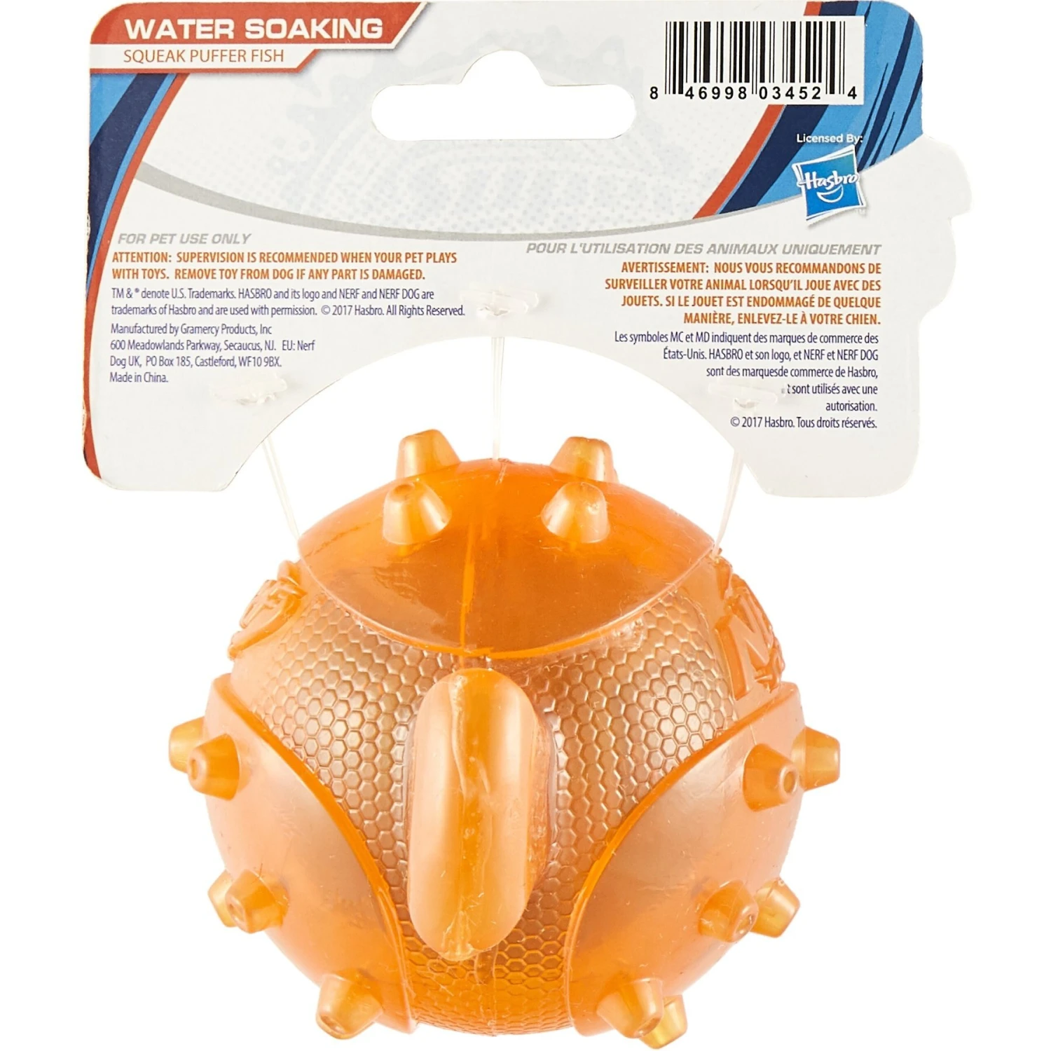 Give your energetic pal a splash-friendly toy optimized for extra-tough tossing, fetching, and tugging with the Nerf Dog Super Soaker Squeak Puffer Fish Dog Toy. It’s built with special materials to withstand hours of play like thermoplastic rubber that can stand up to extended rounds of fetch, and a crinkle plush interior with squeakers to make playtime that much more exciting. Your pal will love the squeaking sounds and the Super Soaker design that’s ready for water play anytime you are! Plus, thanks to its aerodynamic shape, it’s the perfect toy for on-demand games of fetch indoors, at the park, or at your favorite spot.
