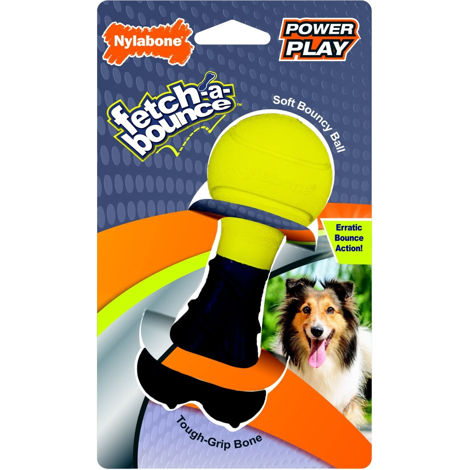 - This bouncy toy features a rubber dog bone on one side and a rubber ball on the other.
