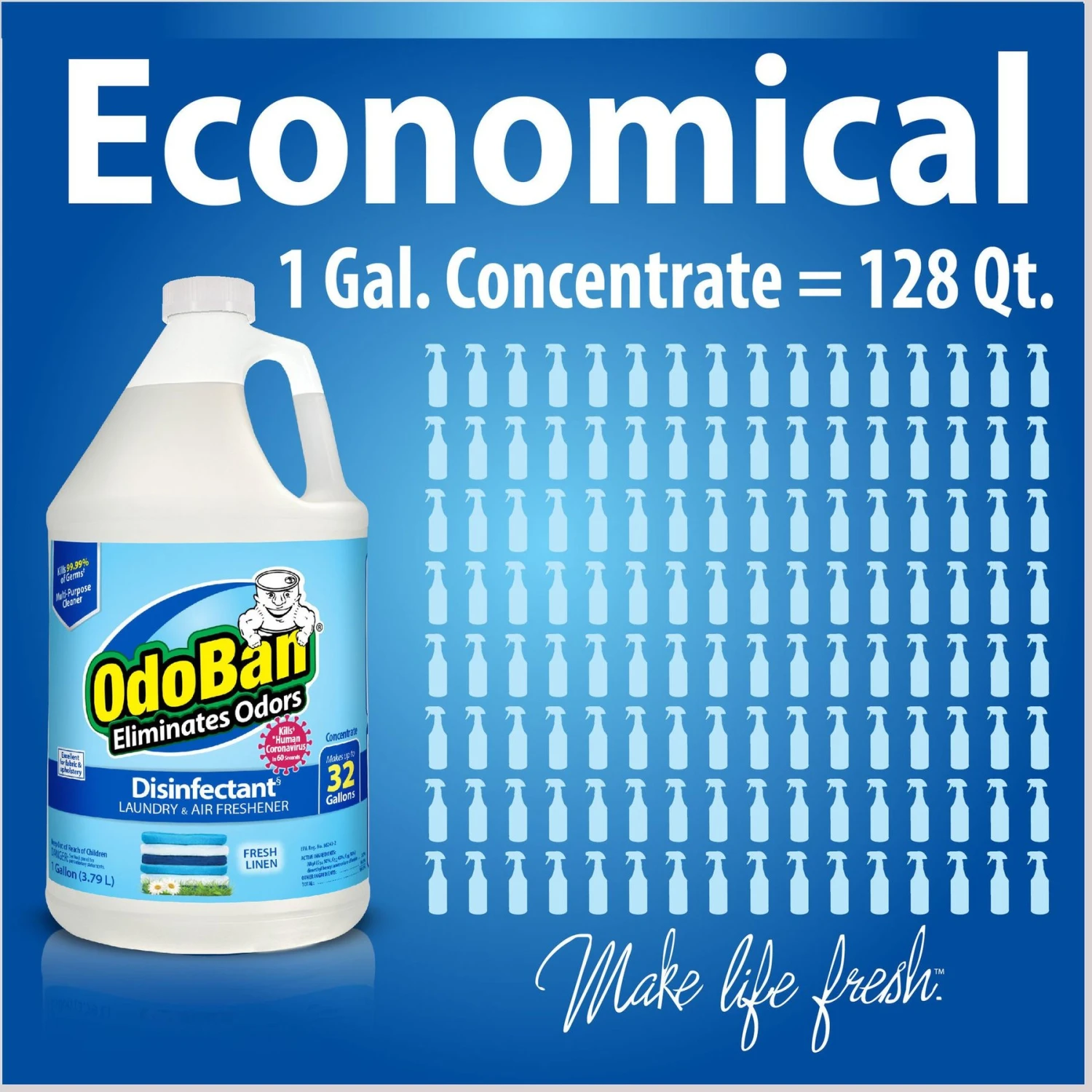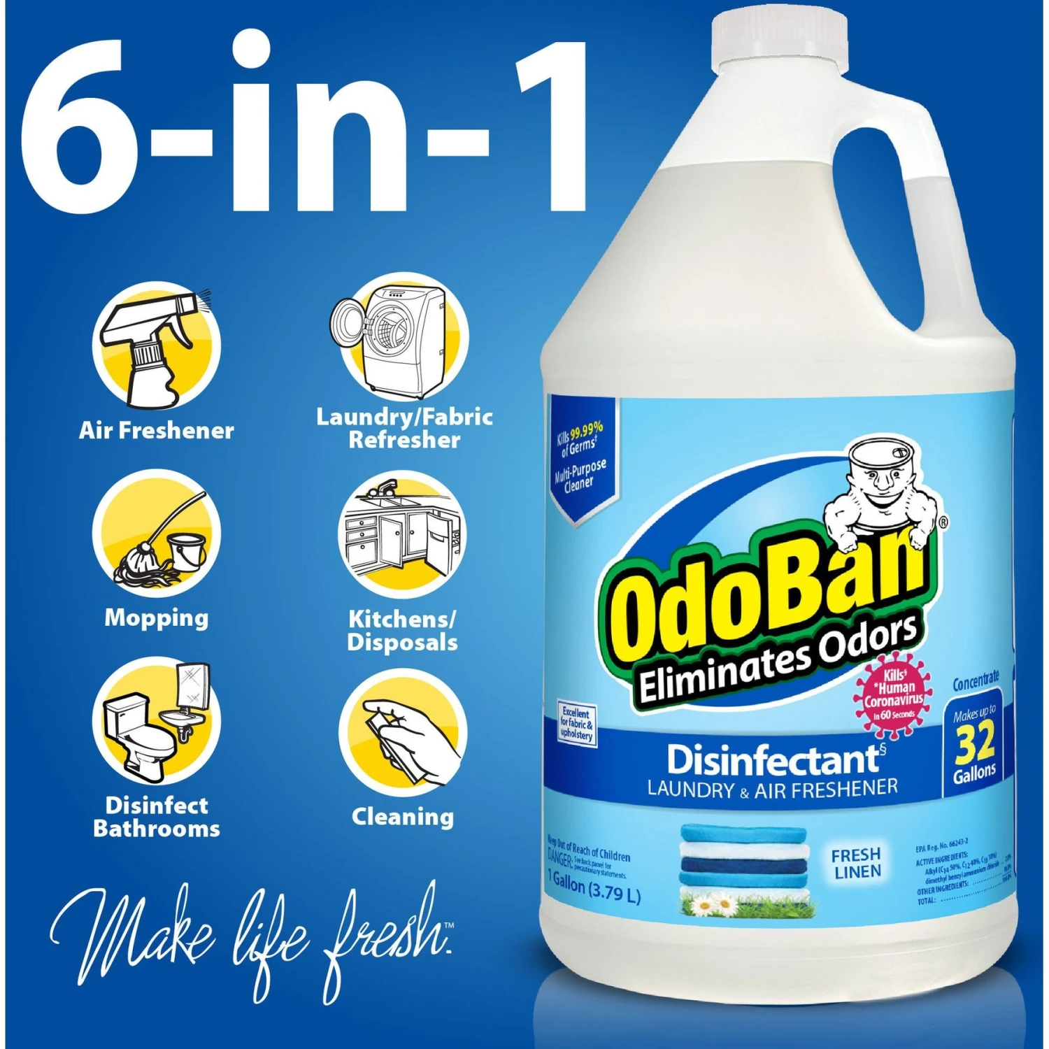 Keep your home clean, sanitized and smelling fur-esh with OdoBan Concentrate Fresh Linen Disinfectant! It kills the human Coronavirus in 60 seconds on hard, nonporous surfaces when used according to disinfection directions. It also kills 99.99% of germs such as strep, E. coli, listeria, Staph and Klebsiella pneumoniae on hard, nonporous, non-food-contact surfaces in 60 seconds when used according to directions. Designed to remove pet odors like urine from your pet pooch’s bedding or kitty’s litter box, it’s also a paw-fect fabric fur-eshner and deodorizer. It eliminates food and musty odors on washable surfaces such as upholstery, carpets, bedding, showers, walls and floors, while leaving a fur-esh scent. It also cleans, disinfects, sanitizes and deodorizes your household surfaces that are pre-cleaned, hard and nonporous. This paw-some disinfectant can also be used in carpet cleaning machines if you don’t heat it, or in a steam cleaning machine. You’ll love this deodorizer’s many fur-esh uses, and that it contains no dyes, no phosphorous and has a neutral pH.