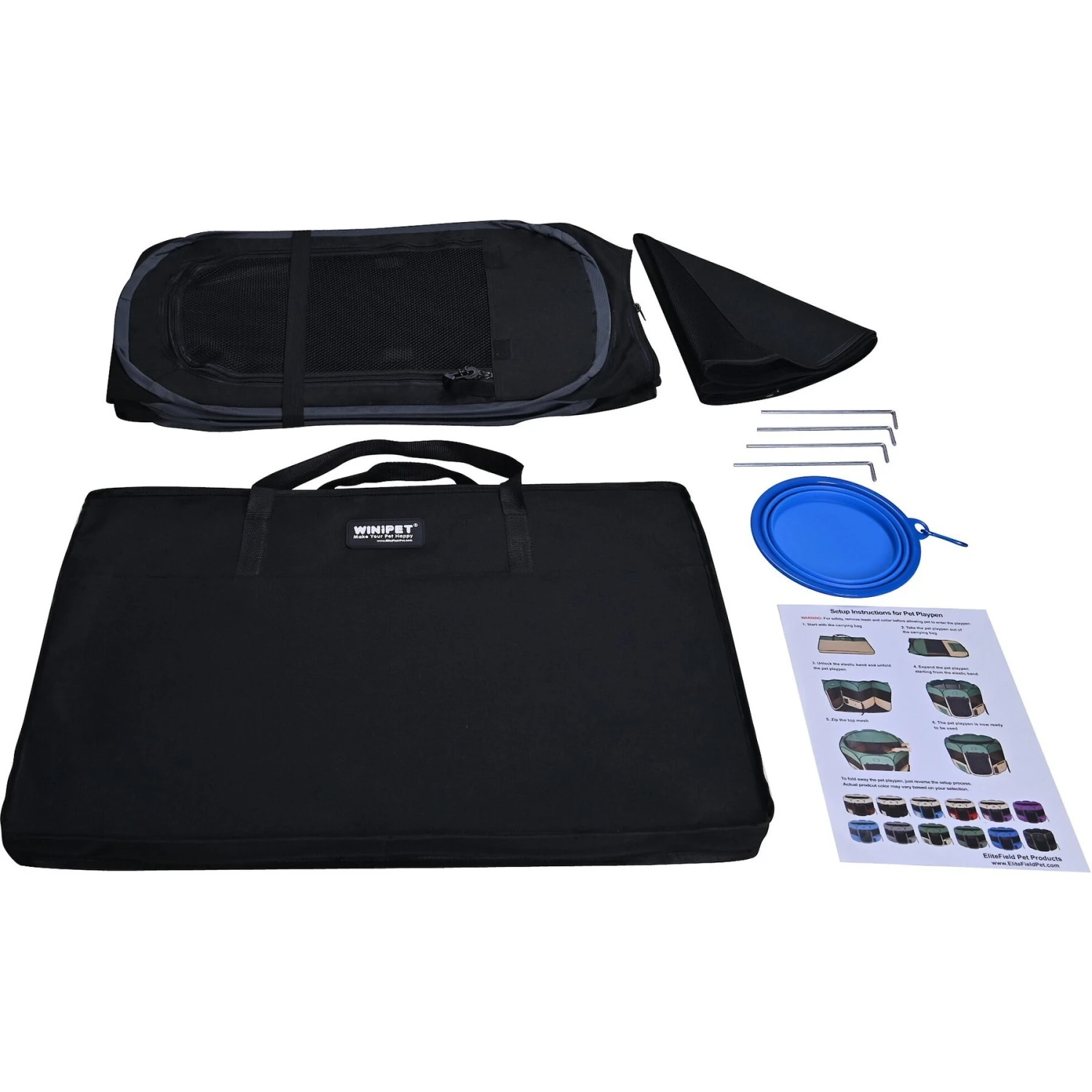 Keep your fur-iend secure anywhere you go with WINiPET’s 2-Door Soft-Sided Dog & Cat Playpen. This portable, soft-sided pet enclosure features two zippered doors to give your pal multiple ways to enter and exit. Use the removable, zip-off shade top cover to help protect him from the elements. Made with durable, easy-to-clean fabric, this lightweight playpen is a snap to set up and fold back down. This product also comes with a silicone bowl, ground stakes and a convenient carrying bag. It’s terrific for all your ex-paw-ditions—indoors or out!